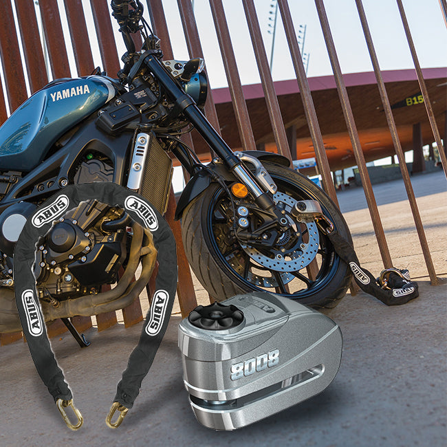 New from Abus the Granit Detecto 8008 is the most secure alarm disc lock available. With the security level of 19 (level 20 with chain combination) there is no higher single piece of motorcycle security you can buy from anywhere. Made from Abus specially developed virgin tempered steel and featuring the proven Detecto 3D alarm activation system this lock will sound a loud 100DB alarm while resisting all types of brutal attacks like cutting, hammer and prying. The chain has 12mm hexagonal links made from the same tempered virgin steel for ultimate resistance against cutting and brutal attacks. Fabric sleeved to protect bike paintwork. The X Plus key is Abus’s most pick resistant key system with over 1.4 million possible variations. Endorsed by many European insurance companies and motorcycle magazines.